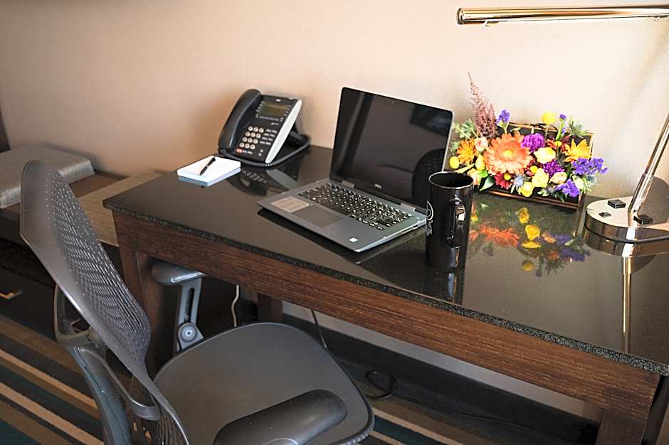 Free WiFi and a 55” flat screen HDTV with with Chrome cast support are offered in this room. A spacious work desk, mini refrigerator, Keurig coffee maker and a kettle for tea and a safe are provided. A private bathroom includes a glass enclosed rain shower.